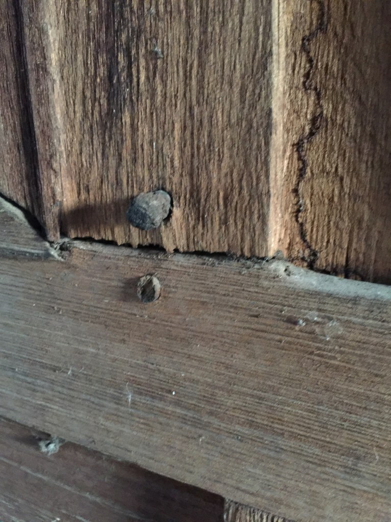 ลูกสลักไม้แบบตอกฝังจมซึ่งถอดรื้อจากเรือนไทยเก่า สังเกตเห็นผิวเรียบมันแสดงให้เห็นผลของการเบียดอัดจนแน่น