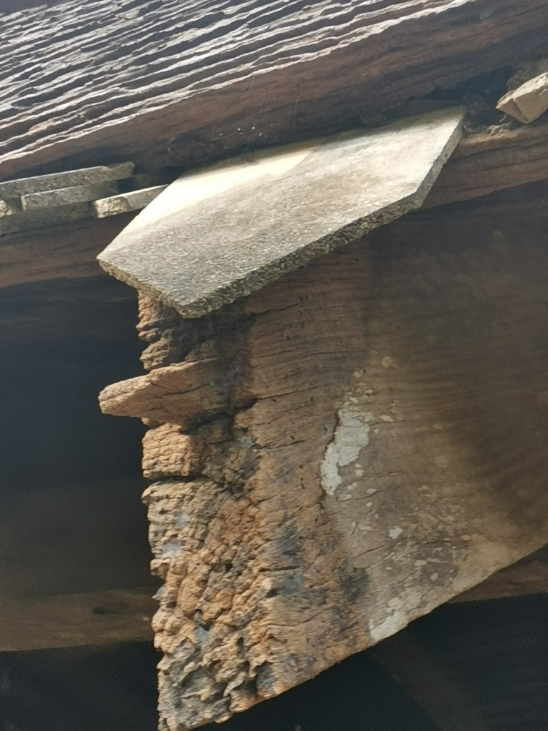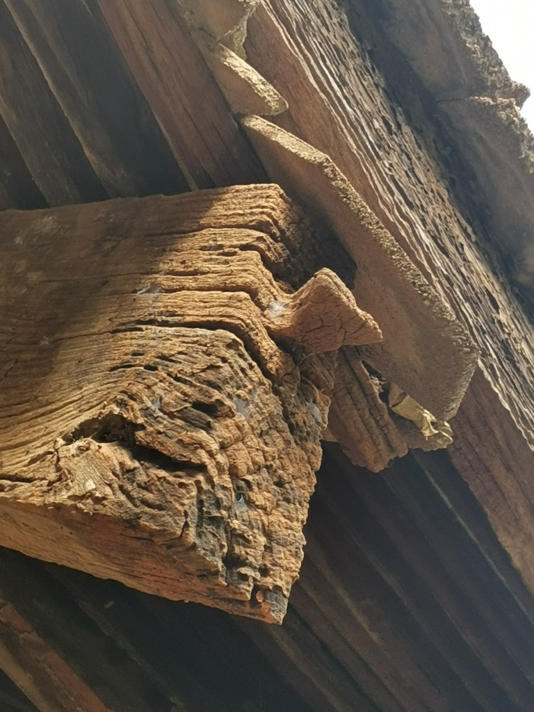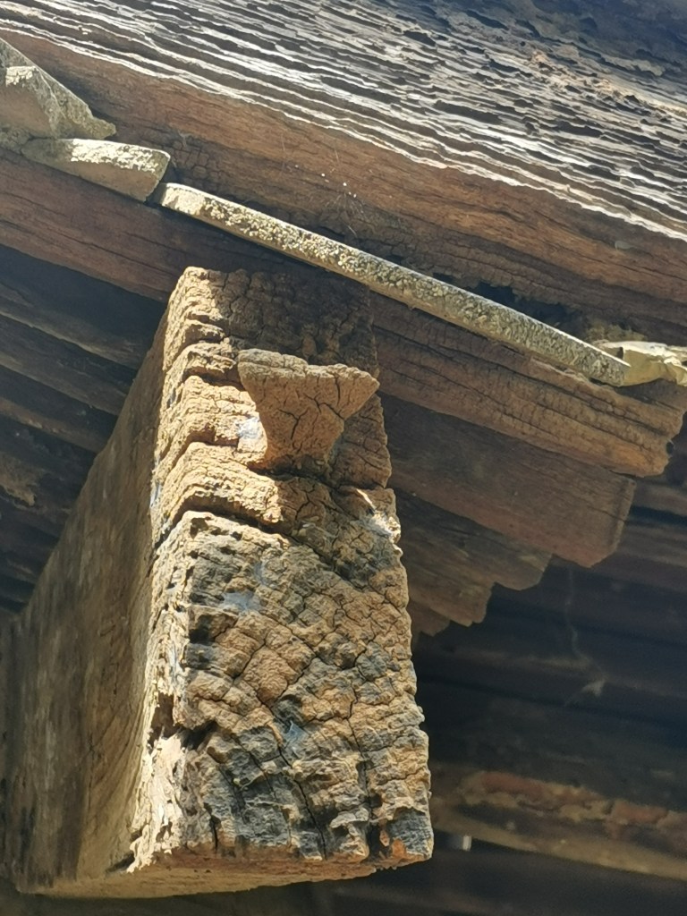 ภาพร่องรอยหลักฐานเดือยเข็นหางเหยี่ยวที่ปลายจันทันของศาลาการเปรียญหลังเดิมก่อนการซ่อมบูรณะ วัดบ้านไร่ จังหวัดอุทัยธานี เดือยหางเหยี่ยวนี้ใช้สำหรับการแขวนจับยึดเชิงชายไว้ โดยที่เชิงชายจะบากร่องลักษณะที่เรียกว่าร่องเดือยเข็น ส่วนหนึ่งของร่องเป็นร่องกว้างโดยผนังร่องเสมอกันโดยหน้าตัดเป็นรูปสี่เหลี่ยมมุมฉากมีความกว้างของร่องเท่ากับความกว้างของหางเหยี่ยวที่ปลายจันทัน อีกส่วนหนึ่งของร่องเป็นร่องที่แคบลงโดยมีหน้าตัดขวางของร่องเป็นรูปสี่เหลี่ยมคางหมู เมื่อติดตั้งเชิงชายก็จะเสียบเดือยให้เข้าในส่วนของร่องกว้างแล้วเข็นลงให้ด้านร่องแคบหนีบล็อคเดือยไว้ กริยาการติดตั้งโดยการเสียบเข็นนี้จึงเป็นที่มาของชื่อเรียกว่า “เดือยเข็น”